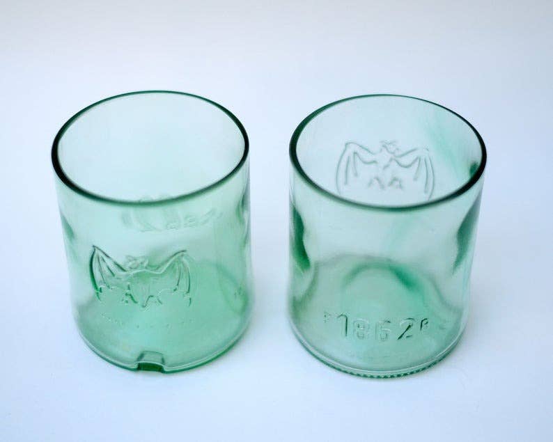 Drinking glasses handcrafted from recycled Bacardi Rum bottles.