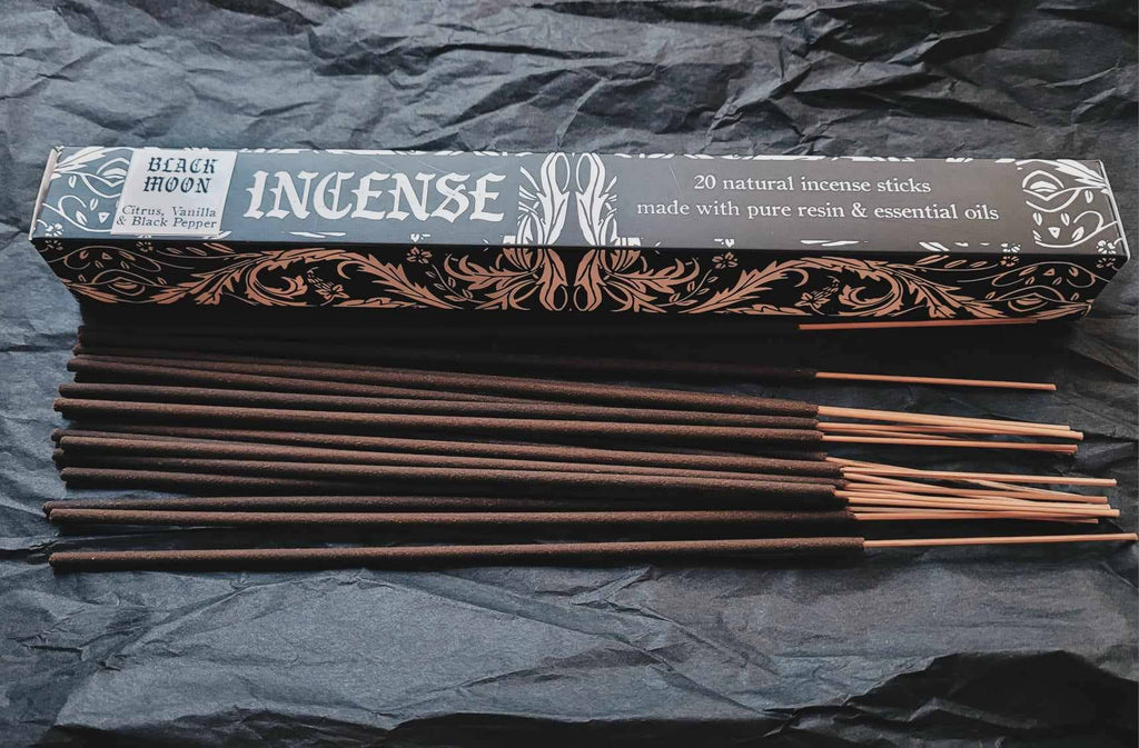 Triple scented, all natural incense made with grounding resins and energizing essential oils. Featuring our beloved (most popular!) Black Moon blend of citrus, vanilla and black pepper. Produces a gentle, all natural, high quality smoke, free of synthetic ingredients.