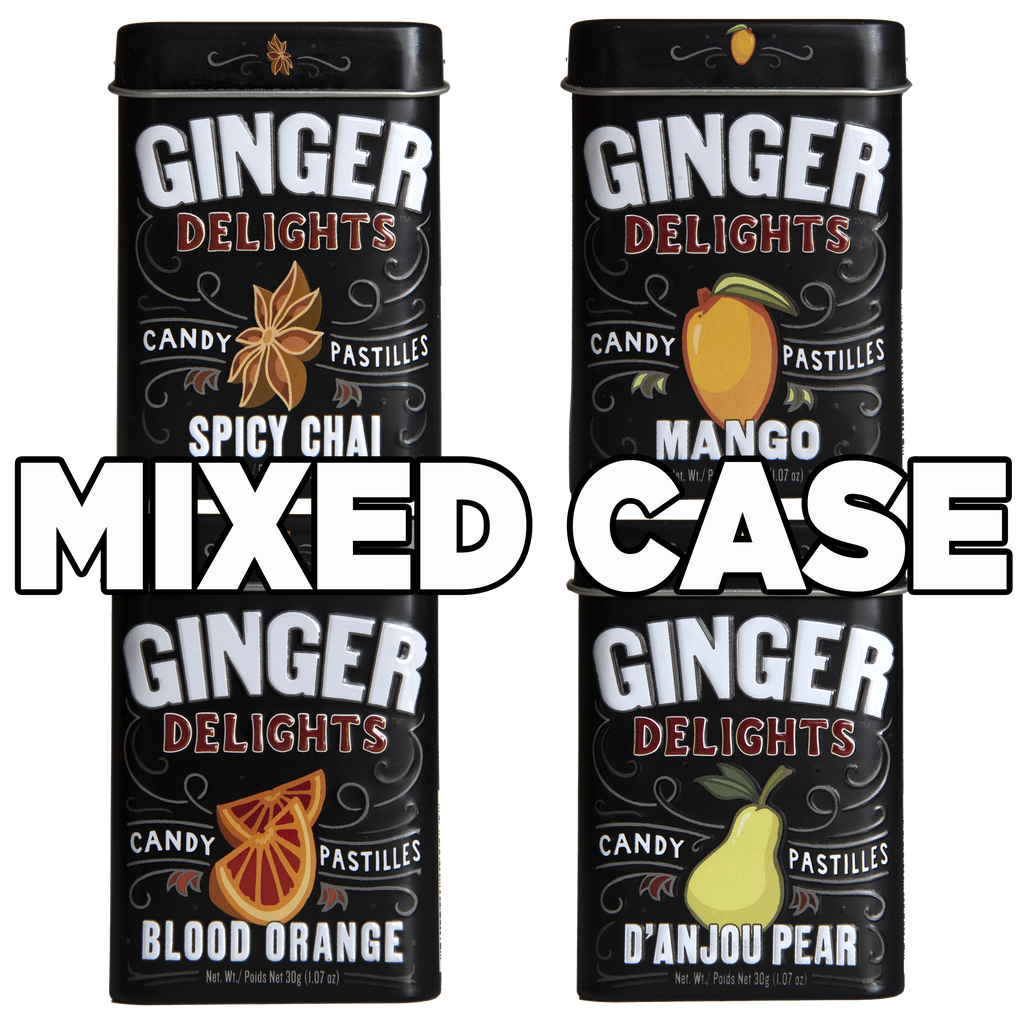 Made for ginger lovers, by ginger lovers in four intensely addictive flavors – D’Anjou Pear, Spicy Chai, Blood Orange and Mango. Mixed case includes: Ginger Delights Spicy Chai x 12, Ginger Delights Mango x 12, Ginger Delights Blood Orange x 12, D'anjou Pear x 12