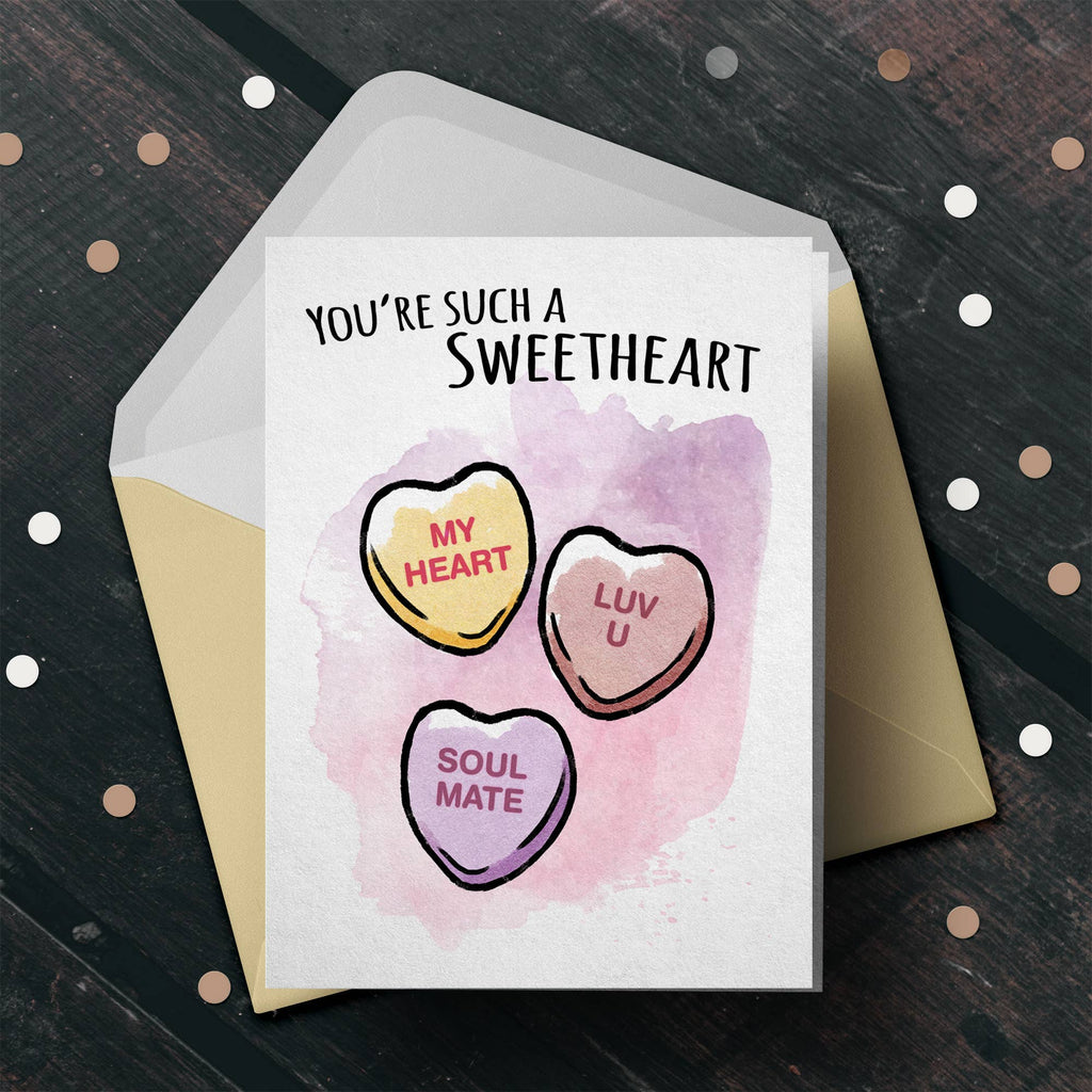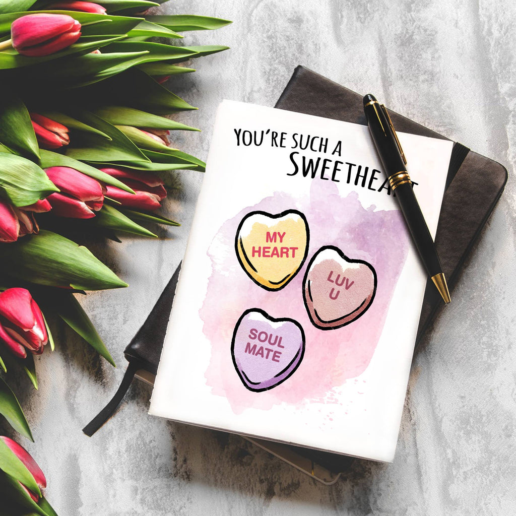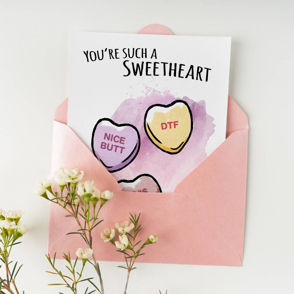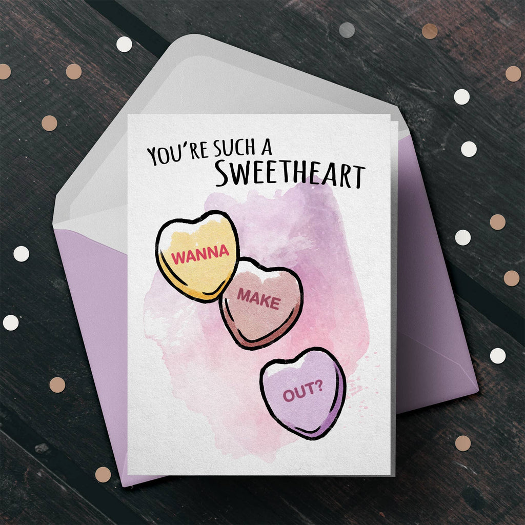 Show your favourite sweetheart, meh-heart, or raunchy-heart that they look good enough to eat. Or that they taste like chalk. Up to you! This crunchy candy heart inspired birthday card is sure to please the cute friend, naughty partner, indifferent partner, or get-to-the-point partner in your life. Send your well wishes with style, with originality, and with the inevitable groan of pun-preciation.