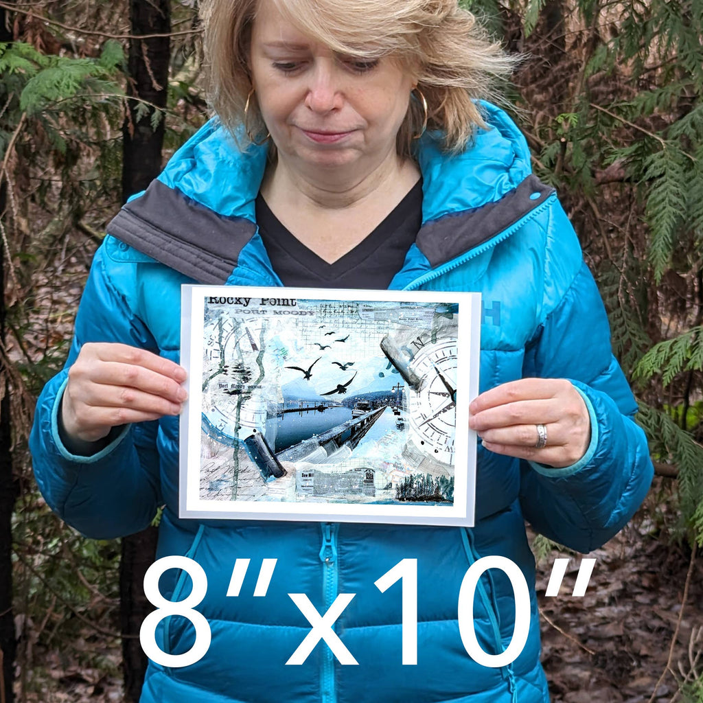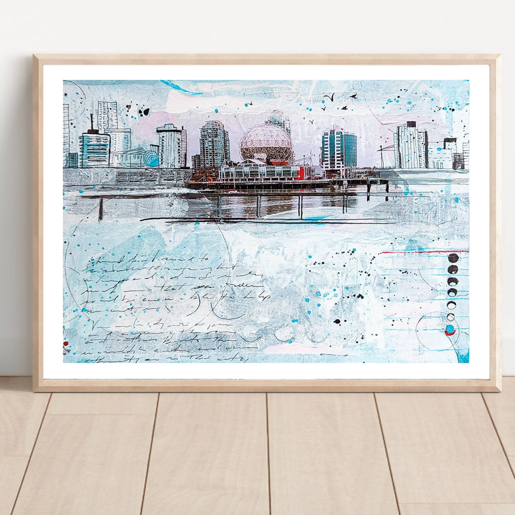 Vancouver's iconic landmark, the Telus Science Dome. Many have walked this path along the seawall to experience the beauty of False Creek. Urban meets nature in this photo mixed media art piece. Created from my own photography and local newspaper as collage, as well as my own illustrations.....the perfect addition to any home decor.